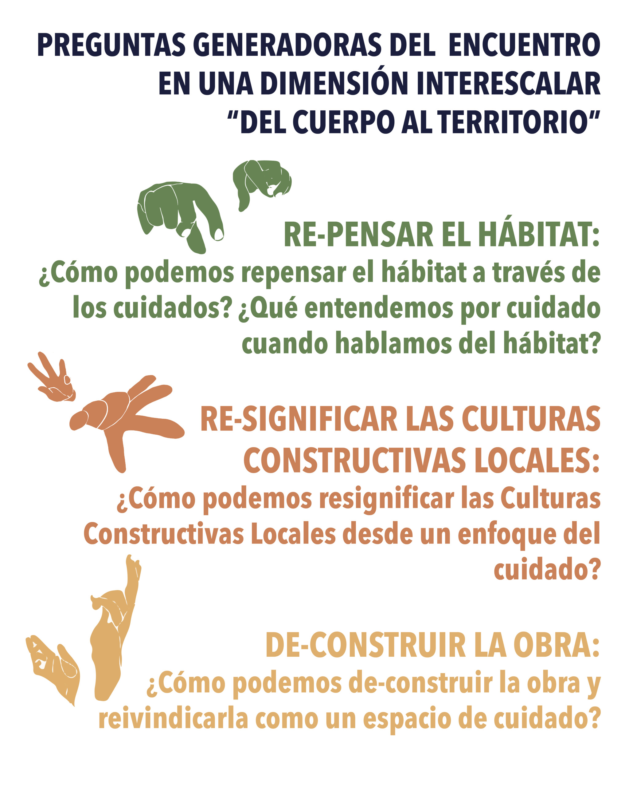 El propósito del encuentro es RE-pensar el hábitat, RE-significar las culturas constructivas y DE-construir la obra, cuestionando los conocimientos formales dominantes que han desplazado los saberes situados de las, los y les habitantes.