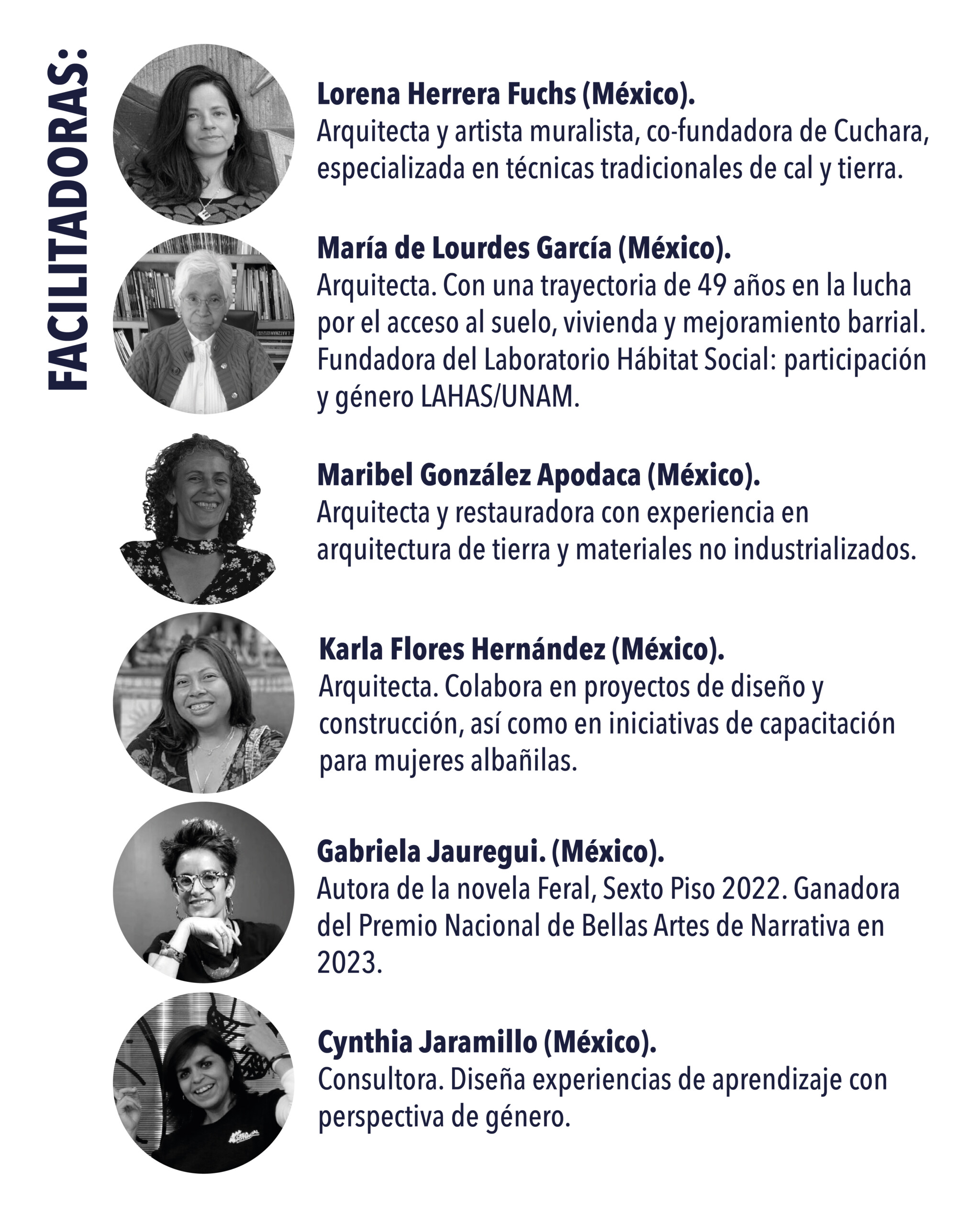Conversatorios y conferencias con voces diversas de México y América Latina que compartirán sus experiencias sobre hábitat, género, cuidados y tejidos comunitarios.