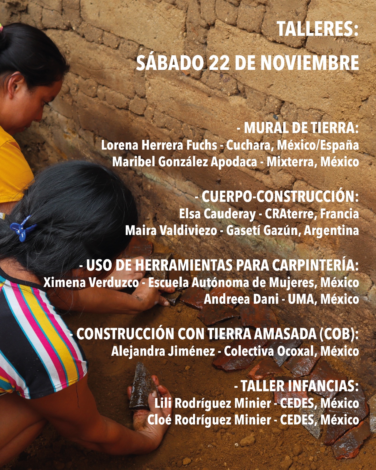 Talleres prácticos, como construcción con tierra y uso de herramientas manuales y eléctricas, donde la práctica se entrelaza con la reflexión colectiva.