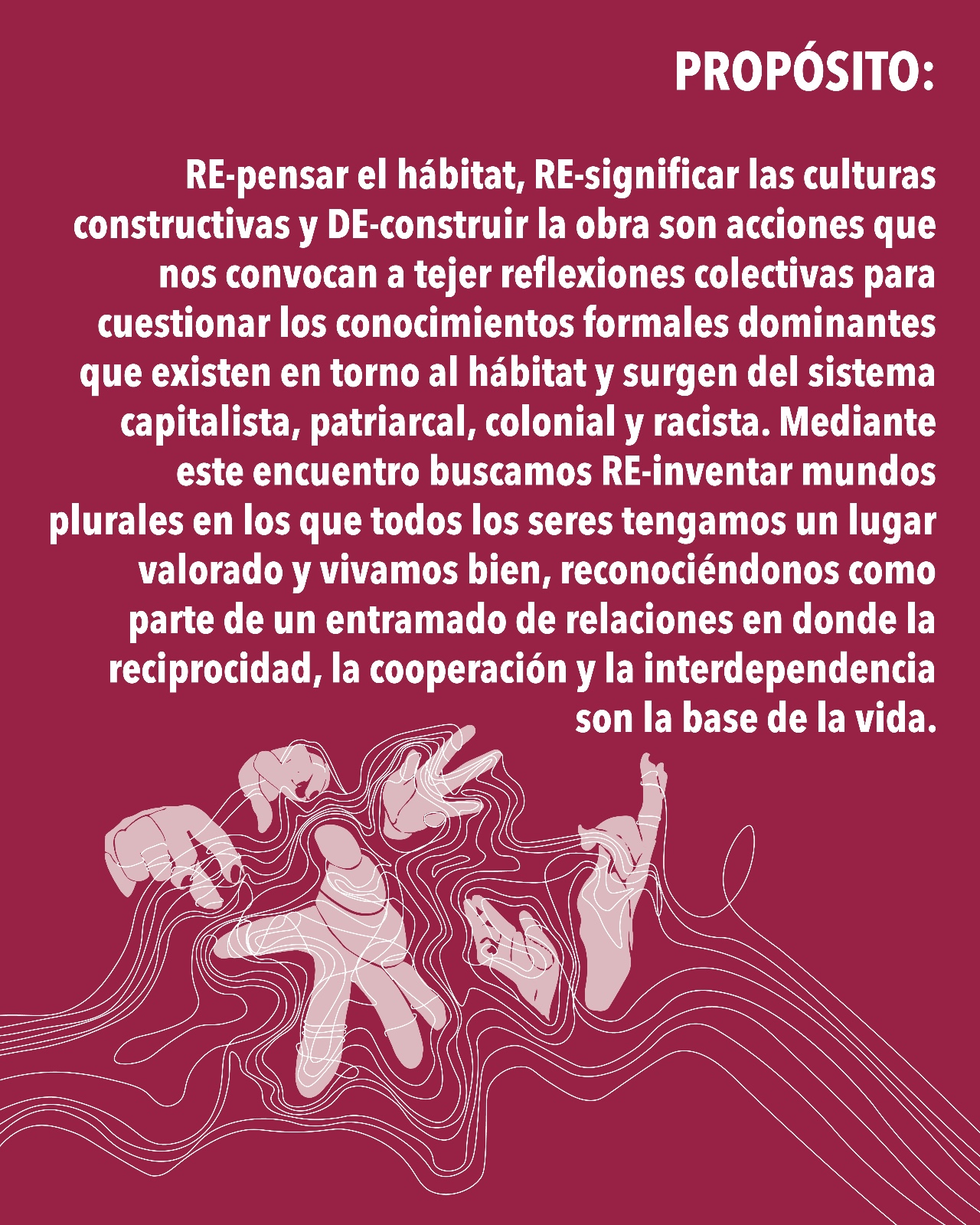 El propósito del encuentro es RE-pensar el hábitat, RE-significar las culturas constructivas y DE-construir la obra, cuestionando los conocimientos formales dominantes que han desplazado los saberes situados de las, los y les habitantes.