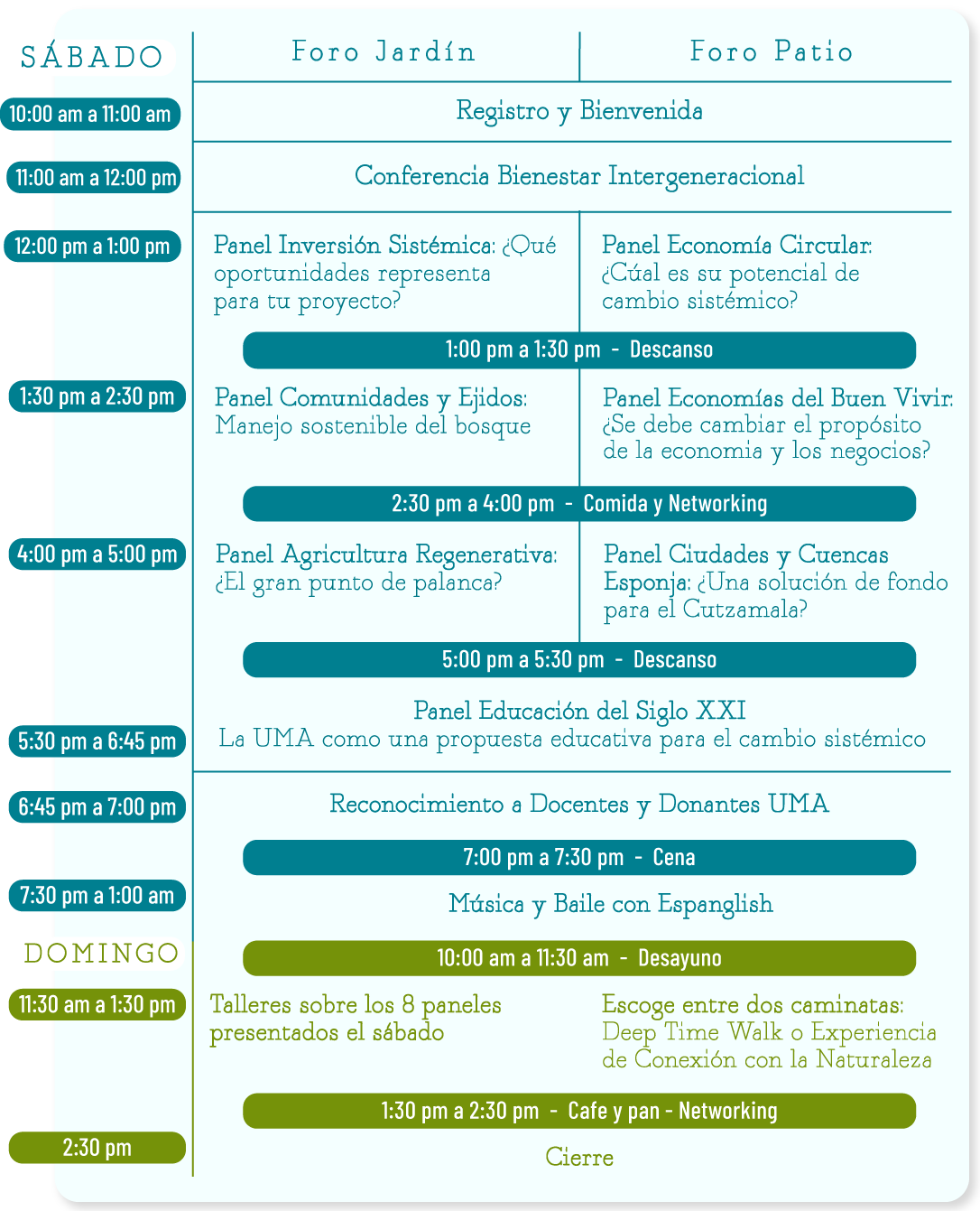 *Caminatas. Si lo que prefieres es conectar con la naturaleza elige entre dos experiencias únicas: ¡Los cupos para estas dos actividades están limitados y se llenan rápido! Una de las experiencias más valiosas del UMAFEST son los talleres, caminatas en la naturaleza y espacios de networking. Para participar, es indispensable que te registres en la liga que recibirás en tu correo después de inscribirte. Sé de los primeros en apuntarte y aumenta la posibilidad de elegir el taller o caminata de tu preferencia, los lugares son limitados. Conectar con estas ideas y posibilidades es increíblemente inspirador y nos llena de energía.